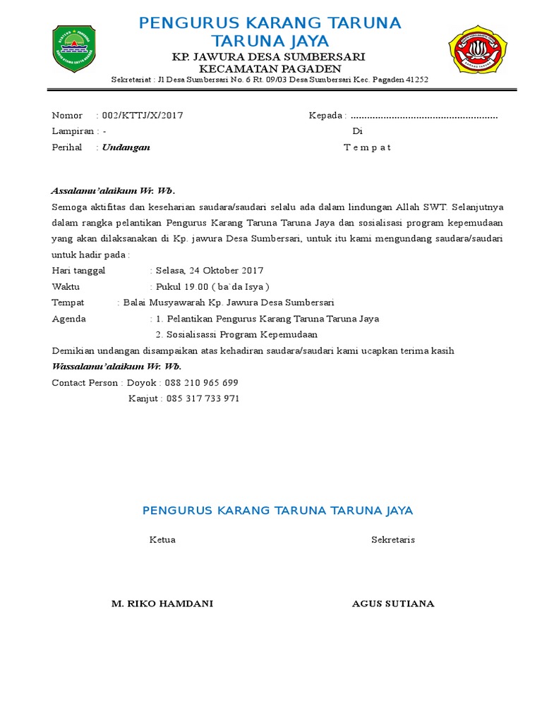 Contoh surat undangan resmi yang baik dan benar. Surat undangan adalah sebuah surat yang dikeluarkan baik oleh pribadi maupun lembaga atau perusahaan yang ditujukan kepada pihak yang bersangkutan dengan isi untuk mengundang mereka agar hadir pada acara yang dibuat. Pembaca yang budiman, paskibra kita tahu mempunyai tugas utama mengibarkan bendera merah putih pada peringatan proklamasi. Download contoh surat lamaran kerja, perjanjian, undangan tahlil, surat cinta, curriculum vitae (cv), yang lengkap, singkat, baik dan benar, doc word dapat anda download. Contoh surat undangan sunatan khitanan format doc terbaru. Misalnya saja melalui panggilan telepon ataupun chatting. Bisa digunakan untuk persiapan acara 17 agustusan atau acara resmi lain. Berikut kami berikan contoh surat undangan resmi yang bisa dijadikan referensi dalam pembuatannya. Berikut contoh contoh undangan tahlil doc ( format ms word ) yang dapat anda download Untuk lebih paham lagi soal surat undangan silahkan perhatikan contoh berikut ini Bertemu lagi dengan saya husnul. Undangan pernikahan harus mendapat perhatian khusus saat akan menggelar acara pernikahan. Nah, surat resmi biasa digunakan untuk tujuan acara yang resmi, sedangkan.