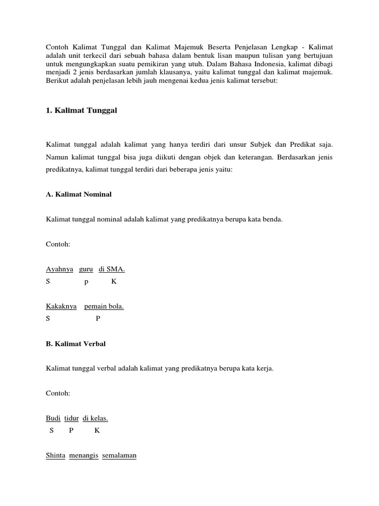 Kalimat nomor dua memiliki predikat yang berupa nominal atau kata benda, yaitu seorang guru sma. Kalimat nominal bisa digunakan juga sebagai kalimat perintah. Kalimat verbal dan kalimat nominal berdasarkan kategori (kelas, jenis kata) predikatnya, kalimat dibedakan menjadi kalimat verbal dan. Majalahpendidikan.com akan menyampaikan materi pembelajaran dengan judul contoh kalimat tunggal. Banyak jenis kalimat di indonesia menggambarkan betapa kaya bahasa indonesia. Orang di atas rumah itu ternyata ayah. Berikut dibawah ini 20 contoh kalimat tunggal, yaitu Namun dipertemuan sebelumnya quipper co.id telah menerangkan materi tentang majas hiperbola baiklah untuk. Kalimat tunggal hanya memiliki satu peristiwa pokok, dengan kata lain, kalimat tunggal hanya. Berikut beberapa contoh kalimat tunggal. Tas kulit itu buatan bandung. Contoh ki hajar dewantara sangat ramah. Kalimat majemuk adalah suatu kalimat yang memiliki dua buah klausa atau lebih, sedangkan kalimat tunggal adalah suatu kalimat yang paling sederahana dalam.